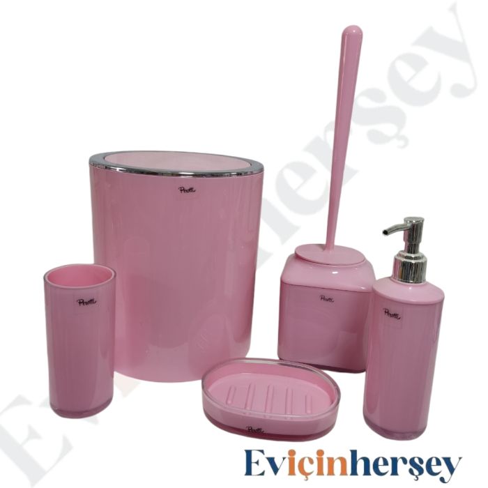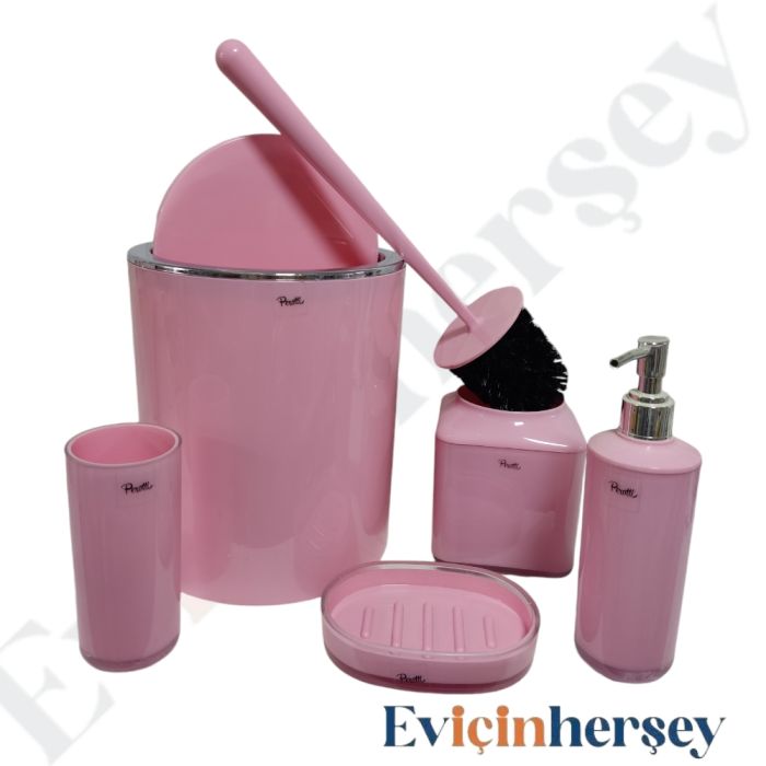 Set içinde sıvı sabunluk,sabunluk,diş fırçalık,tuvalet fırçası ve kapaklı kovadan oluşmaktadır.